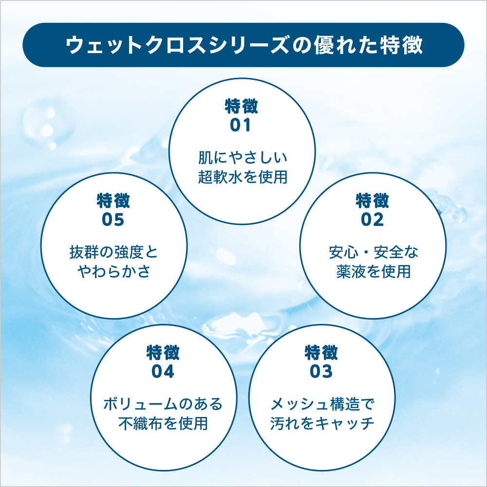 安全な薬液と超軟水を使用。薄手だから細かな拭き取りに便利。しっかりとしたレーヨン不織布タイプ。個包装だからいつでもどこでも清潔、作業負担の軽減や感染対策に。
