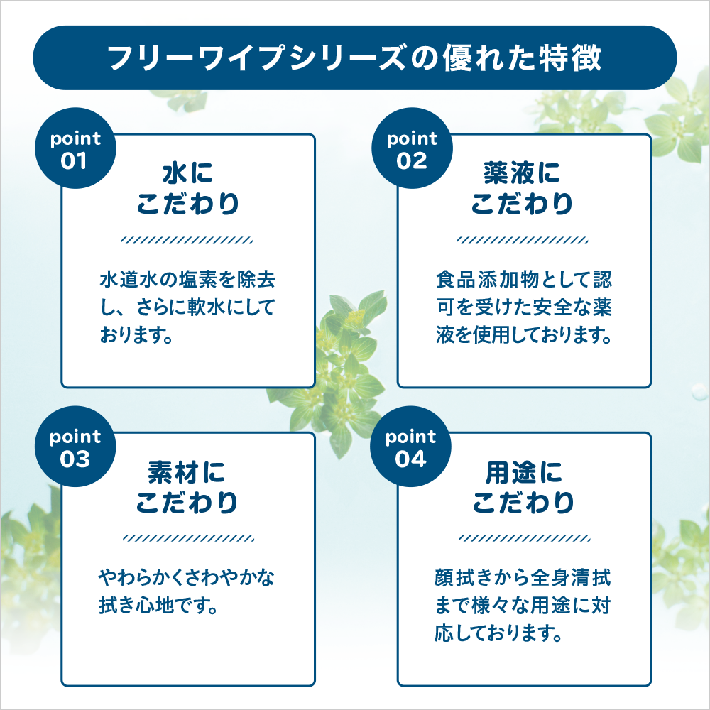 安全な薬液と超軟水を使用。しっかりとしたレーヨン不織布タイプ。個包装だからいつでもどこでも清潔、作業負担の軽減や感染対策に。